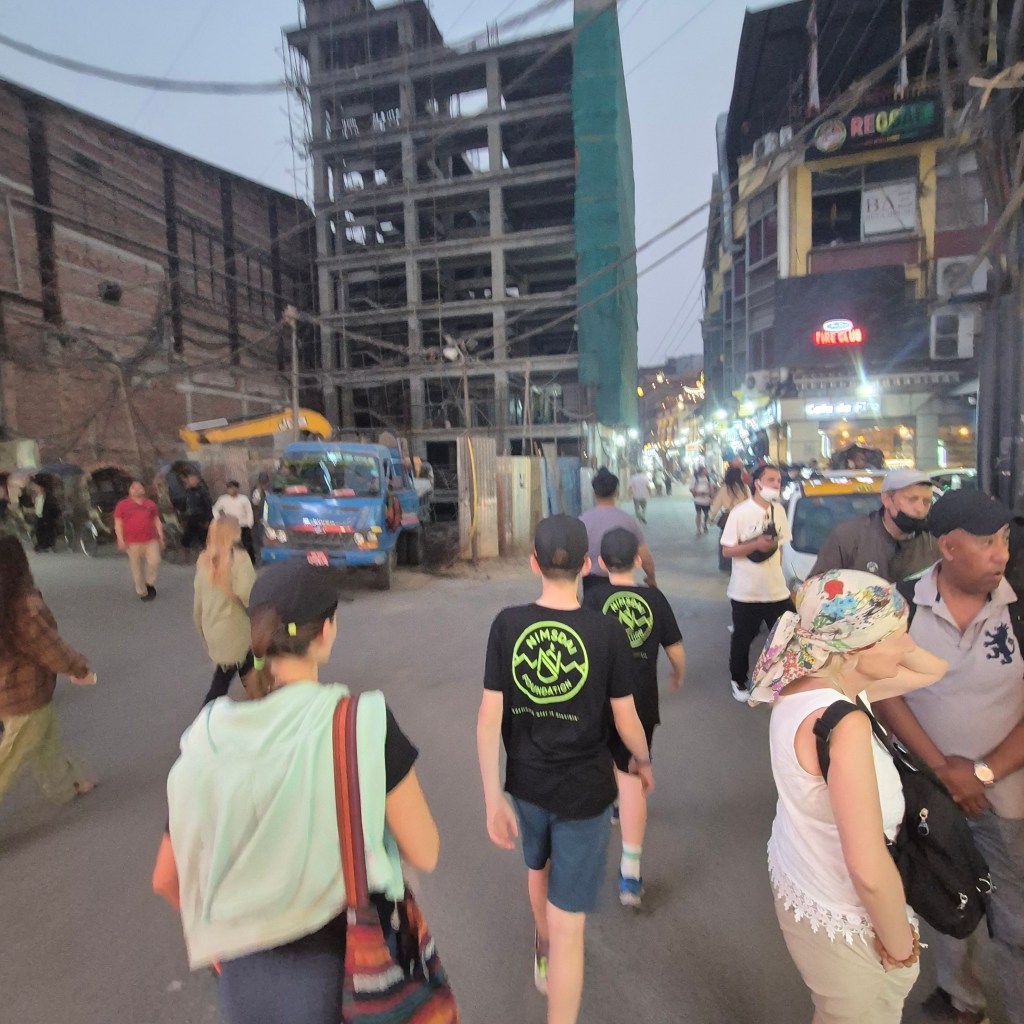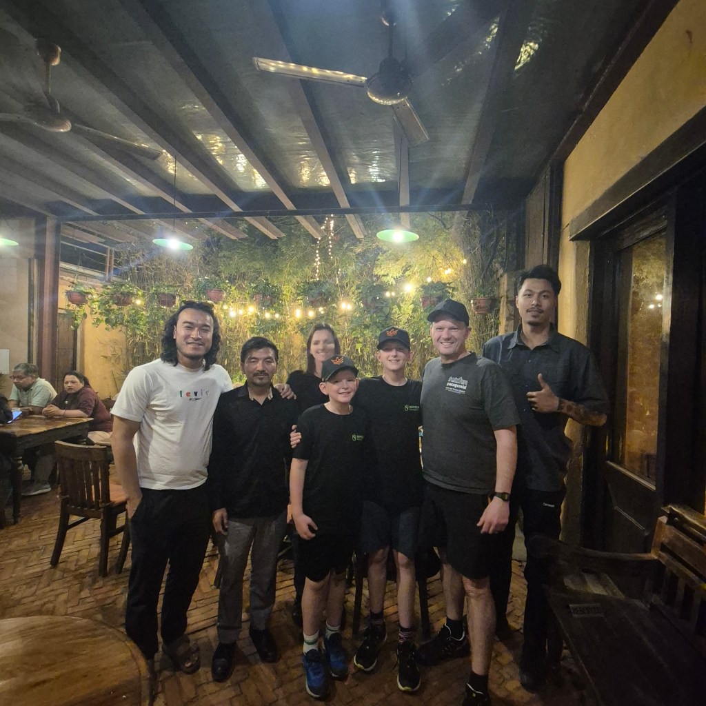 After a good browse around the store, we returned to the Thamel area for dinner. Here, we were greeted with a further treat: dinner with the unique opportunity to be joined by two other world record holders and legends of the mountains – Mingma David Sherpa (He was until 2024 the youngest person to climb all 14 eight-thousanders, and holds the Guinness World Record for “Fastest time to climb Everest and K2”, which he did within 61 days) and Tejan Gurung, the youngest British man to conquer the 14 Peaks at only 29 years old. It was inspiring to chat with them and hear about their extraordinary achievements and journeys. It’s truly astonishing what humans can accomplish; climbing Everest is one thing, but to ascend all 14 of the world’s highest peaks, and in Mingma David’s case, to conquer the most dangerous ones multiple times, is truly awe-inspiring. It certainly put our own “little” treks into perspective!