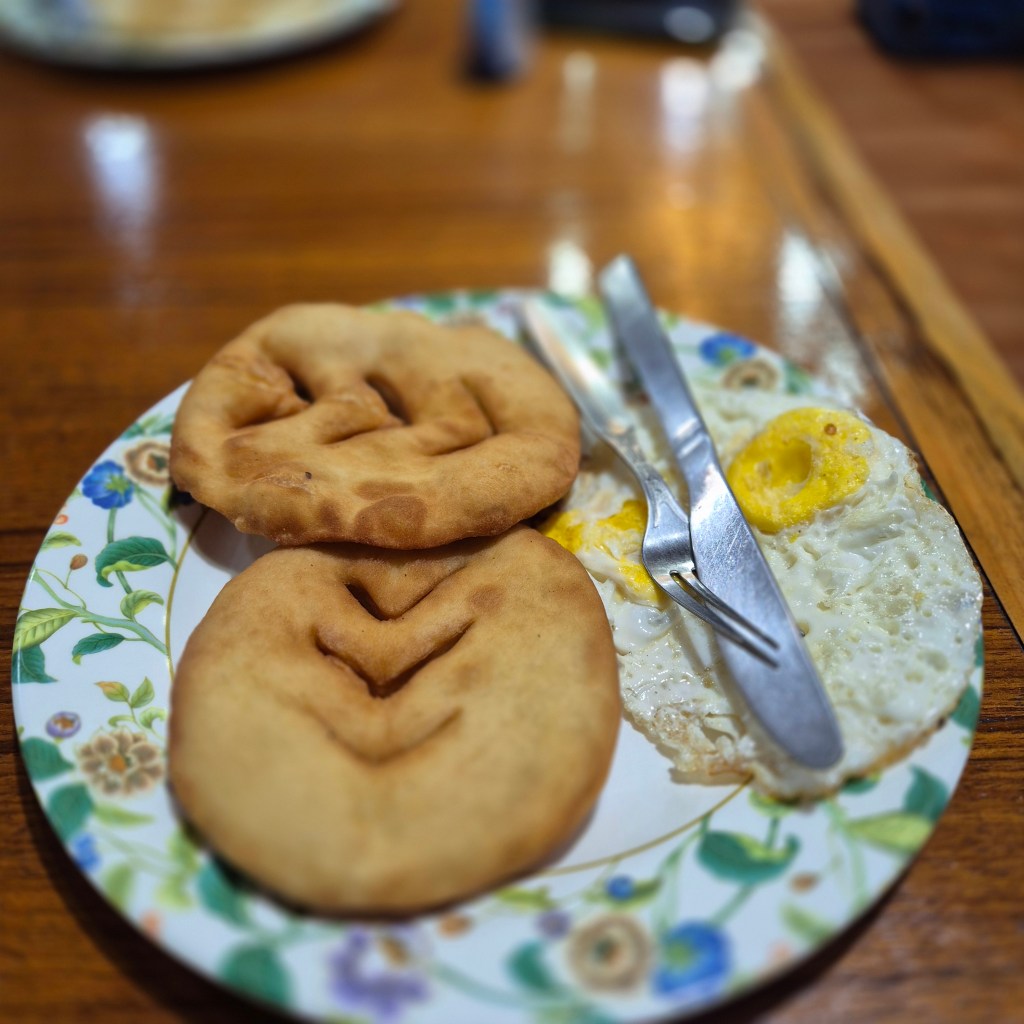 Day 5 of our Everest Base Camp trek kicked off with an early start. Our bags were packed after a 5:30 AM wake-up call, followed by a hearty breakfast at 6:00 AM. Eating enough is crucial for good days on the trail, and it’s important to consume far more than we would normally. For our family of boys, eating is something we do well (perhaps too well back home!). Travel also offers the perfect excuse to try new things, and this trip was no different. Our only caveat was a strict vegetarian diet. This isn’t our usual approach, but we’d read horror stories of people getting ill from eating meat here, due to concerns about how it’s handled in the mountains. This morning, we enjoyed a mix of choices, including Tibetan bread and eggs, alongside the obligatory pancakes. Once we were full, it was time to hike, and we stepped out to a glorious sight: the sun illuminating clear skies and the magnificent mountains surrounding us.