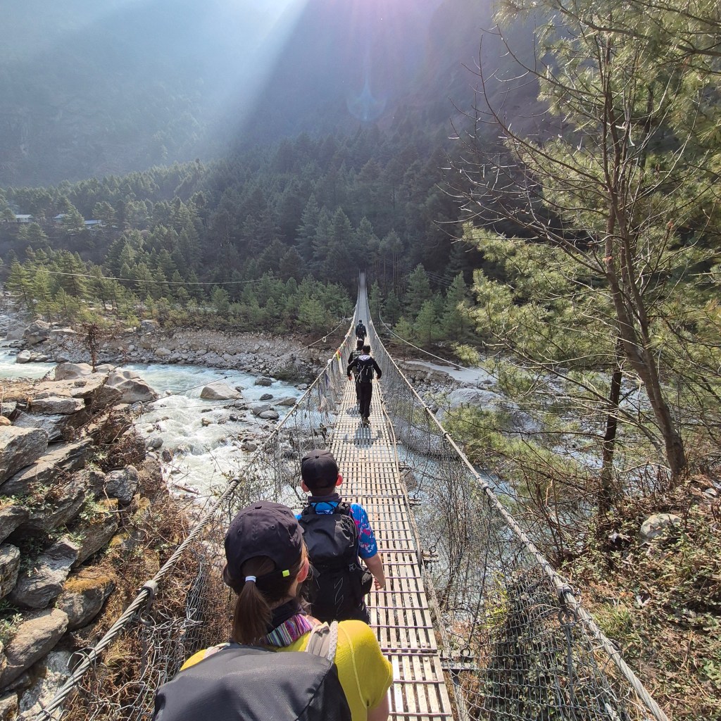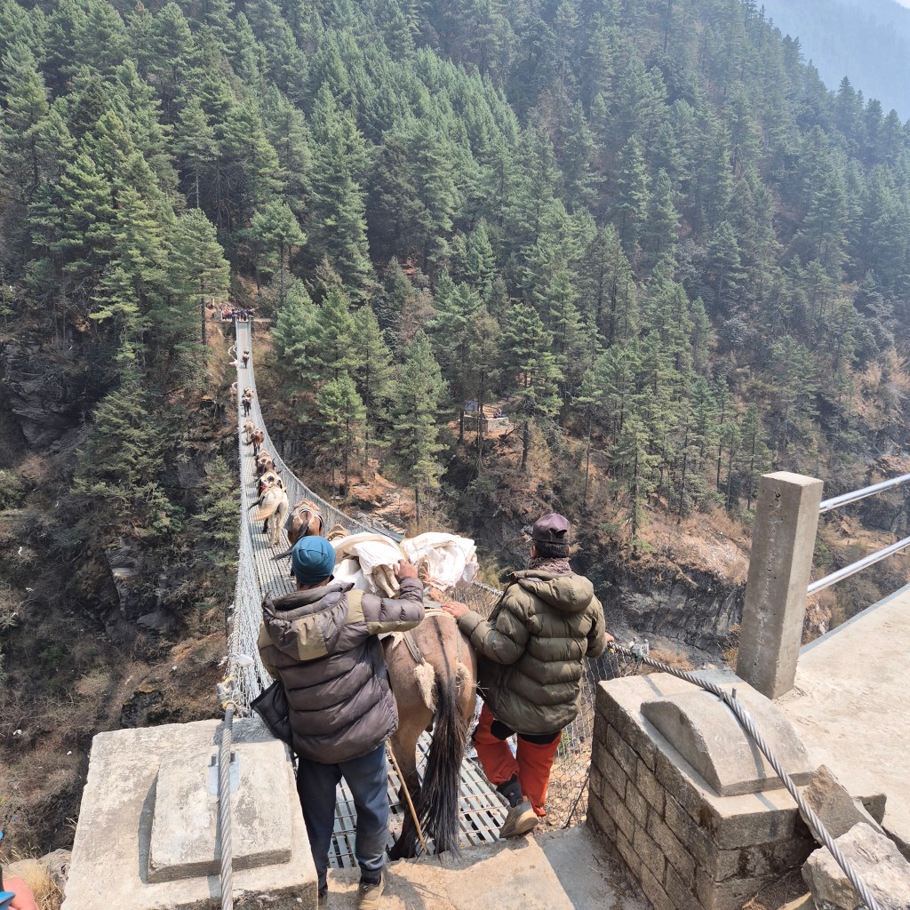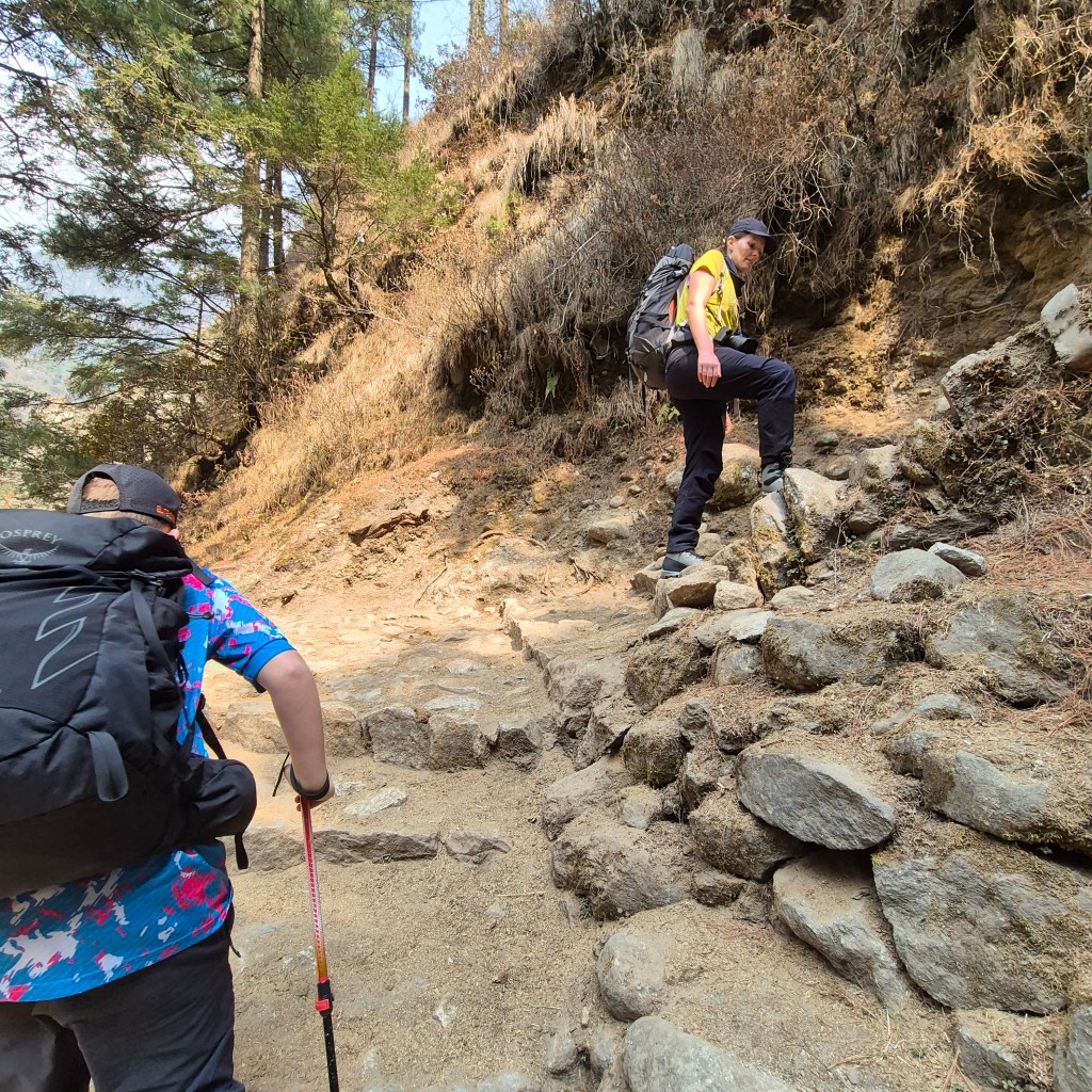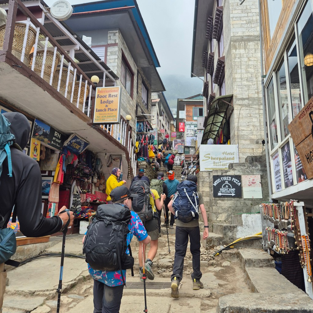 Today’s hike had a relatively easy morning, but a steep incline after lunch led us directly into Namche Bazaar. It also involved a significant number of steps. These proved quite a challenge for everyone, especially poor William with his shorter legs, but he tackled them like a champ! In many ways, the terrain in Pakistan for K2 felt easier, as he could take smaller steps up hills rather than having to hoist himself up these regulated steps. We also crossed many more suspension bridges, including the famous Hillary Bridge. This iconic crossing was incredibly high, a bit windy, and certainly instilled a healthy dose of fear! We were also greeted by a herd of yaks carrying their packs of luggage at the same time. Our guides, prioritizing safety, wouldn’t let us on the bridges concurrently with the yaks or mules, fearing they might charge, leaving us with nowhere to go but over the side. It was surprising how many other guides didn’t enforce this, or how their clients simply ignored the warnings, as if they were in a rush to reach the top! Despite the immense foot traffic it endures, the path itself was in remarkably good condition and easy to hike on (when there aren’t steps!).