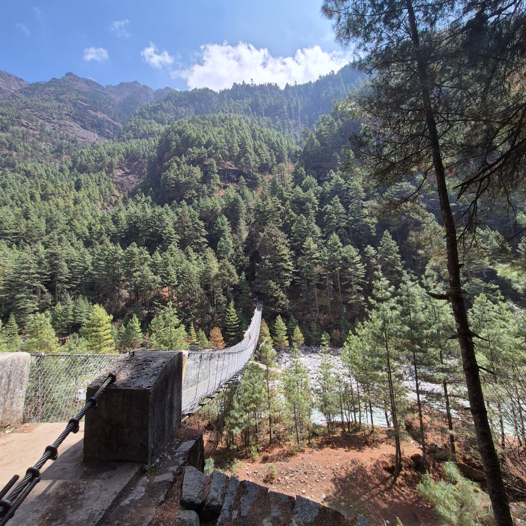 The trail was well-defined and wound through dense forests of pine and rhododendron. We crossed more of the iconic suspension bridges, including the famous Hillary Bridge for the final time—it was just as spectacular on the way down as it was on the way up. The rush of the river and the rustling of the leaves created a soothing backdrop to our last hours of trekking.