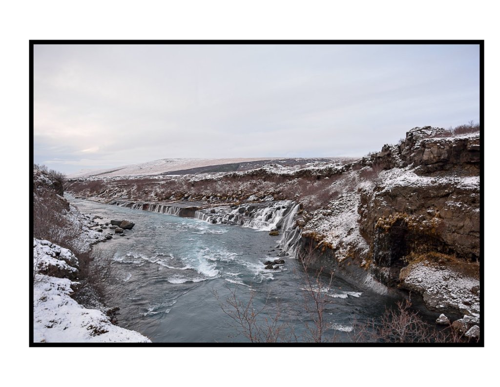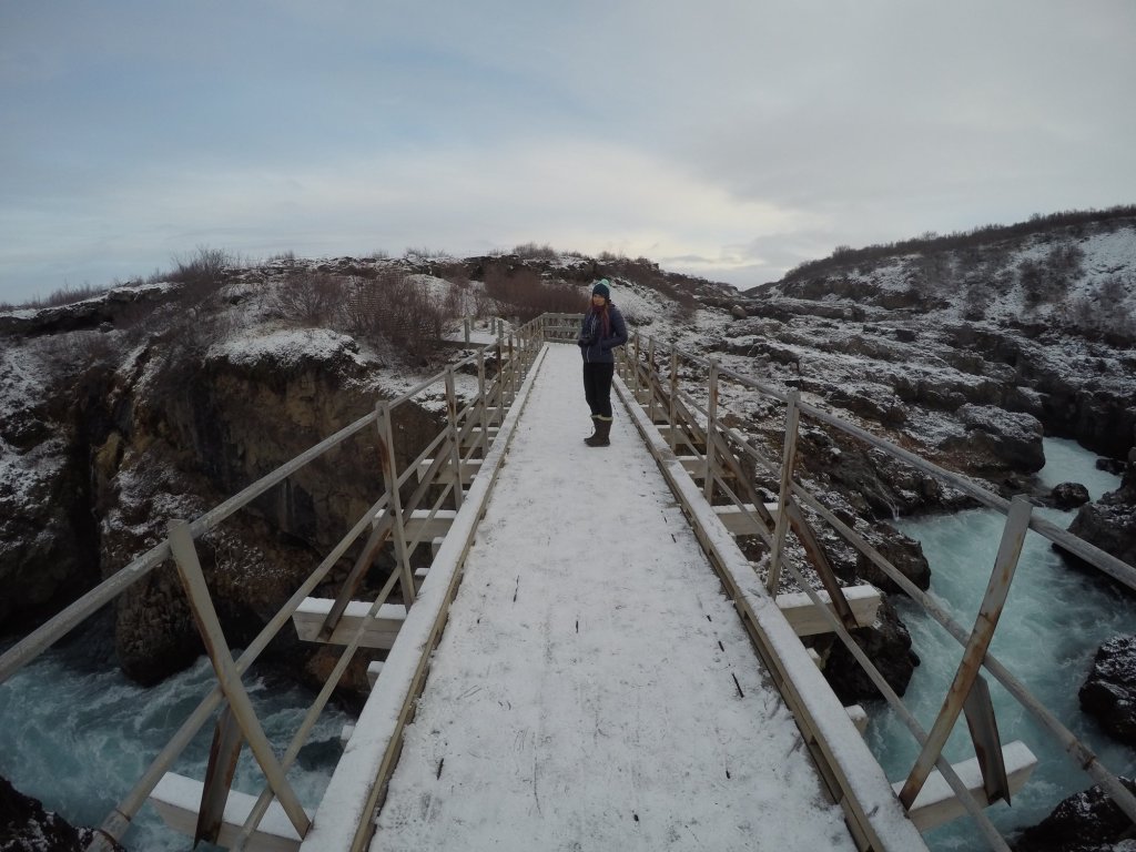 Just a short walk up from the viewing platforms for Hraunfossar is a second waterfall which is more like a gorge or series of rapids called Barnafoss. This waterfall is well known in Icelandic folk law including a story about two brothers who drowned at the falls and the curse put on the falls by the mother of these two boys. There is quite a cool boardwalk and series of bridges which you can follow around and over the falls, but we had to take care as the spray from the falls makes in incredibly slippery in the middle of winter.