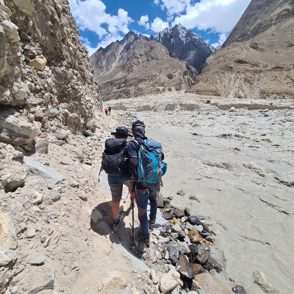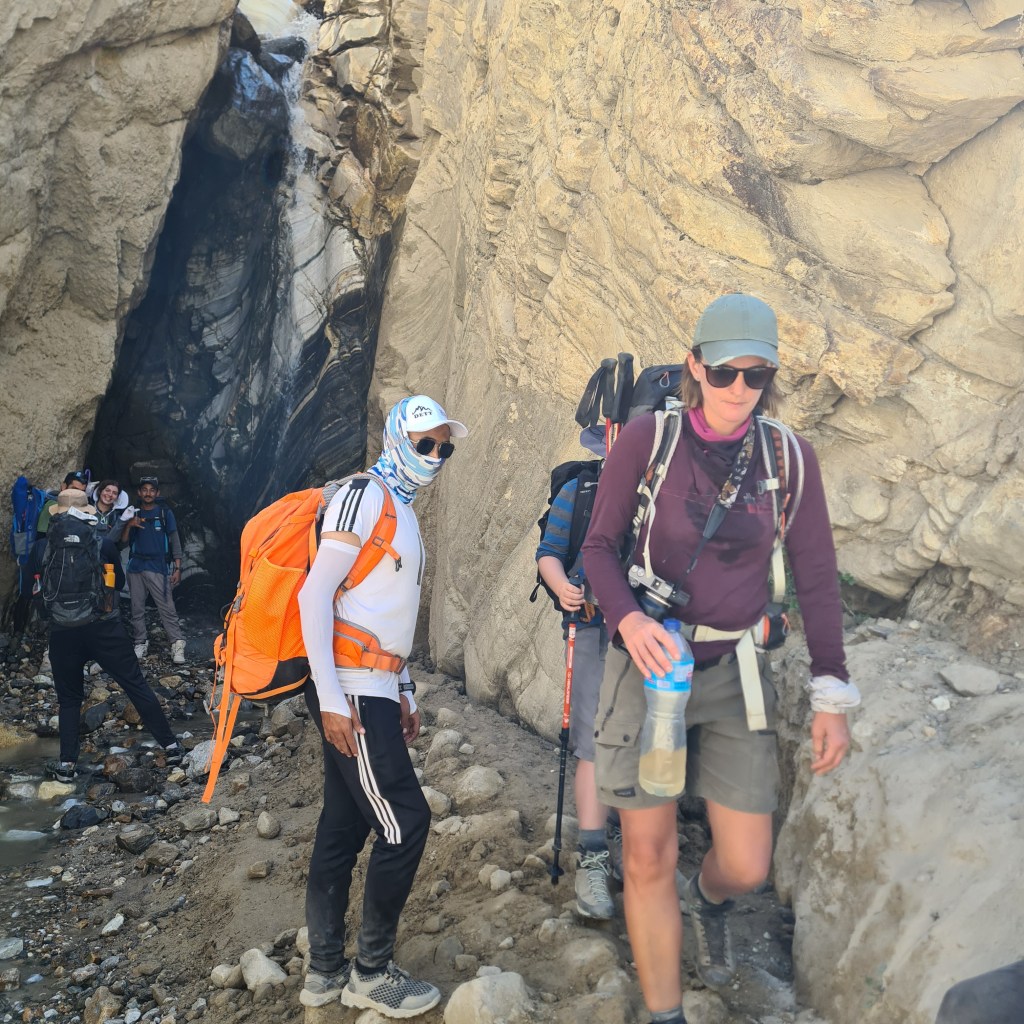 The afternoon brought even more heat, and the dry, sandy terrain felt like a desert. Despite the nearby glacial river, its sediment-laden waters were undrinkable, so we relied on the water we’d packed at lunch. We saw other hikers struggling, too, including seasoned climbers wilting under the sun’s intensity.